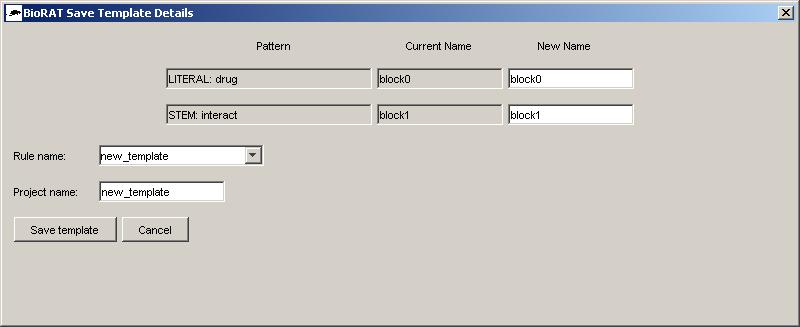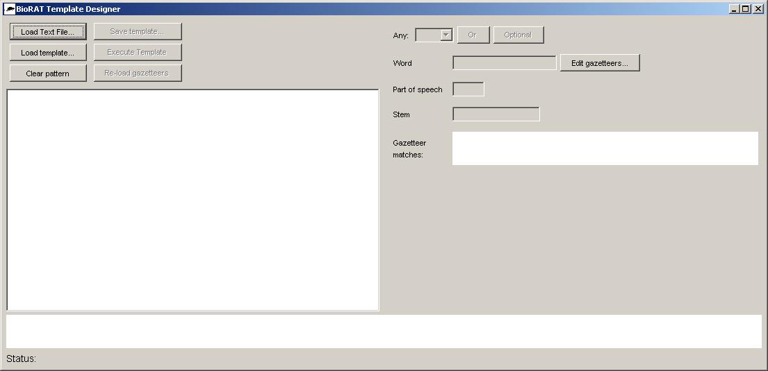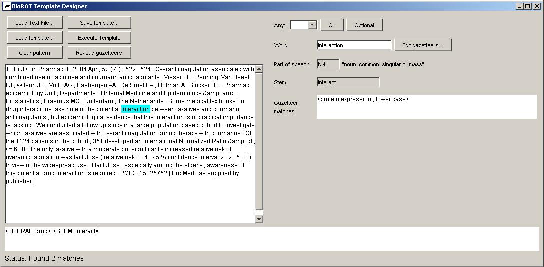 | We've now created and applied a simple template. Other ways to edit the pattern include: directly typing into the pattern box, including deleting entire blocks; using the "Any:" drop down box to allow any noun, any verb or any word at all; selecting "Optional" to make the current block optional (a "?" will appear in it); using "OR" to insert a "|" character between two blocks. |