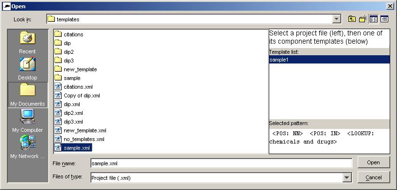 The "open" template window will be displayed. The selected template project file (sample.xml) contains one template ("sample1") shown on the right. The pattern of this template is shown in the lower-right section, starting "<POS:NN>". |