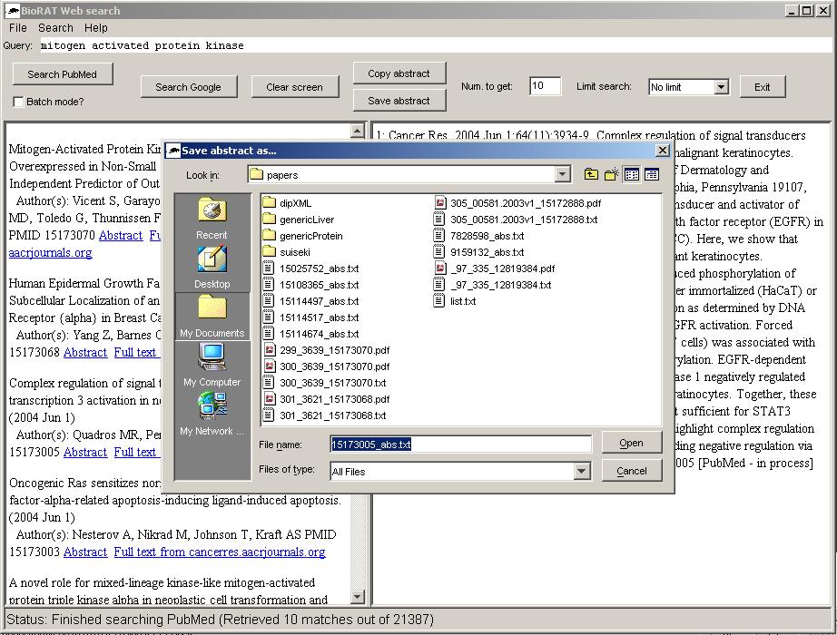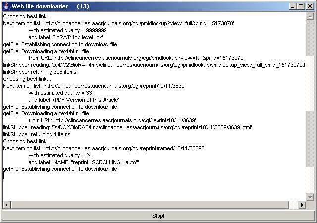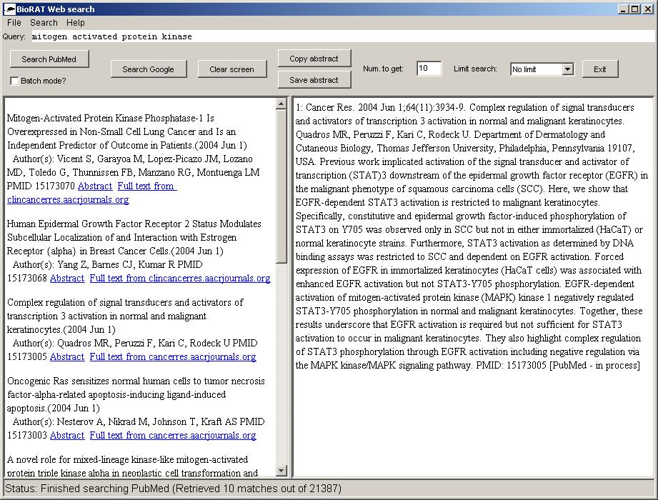 BioRAT will download a number of full-length papers, with no further interaction. Set the maximum number to retrieve in the "Num. to get" box BEFORE starting the search. |