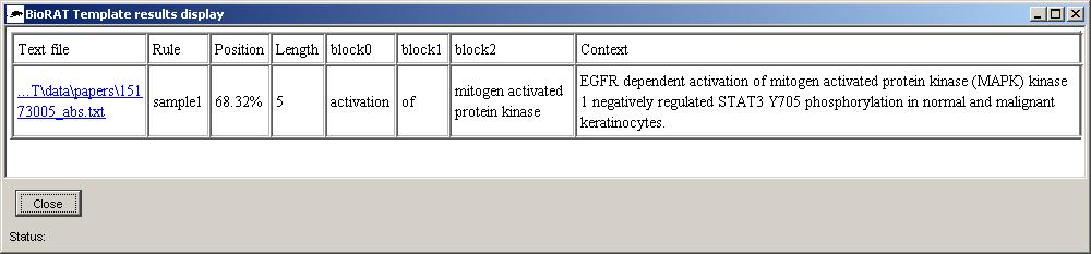 After execution, the results list will be shown. There should be three results, using the unmodified "sample1" template on the abstract with PubMed ID 15025752. |